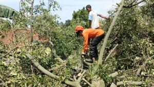Pihak Badan Penanggulangan Bencana Daerah (BPBD) Kabupaten Bogor diterjunkan ke lokasi bencana, untuk menolong warga dan mengevakuasi batang pohon pala dan pete yang berdiameter 80 centimeter dan ketinggian 15 meter yang roboh ke rumah warga.