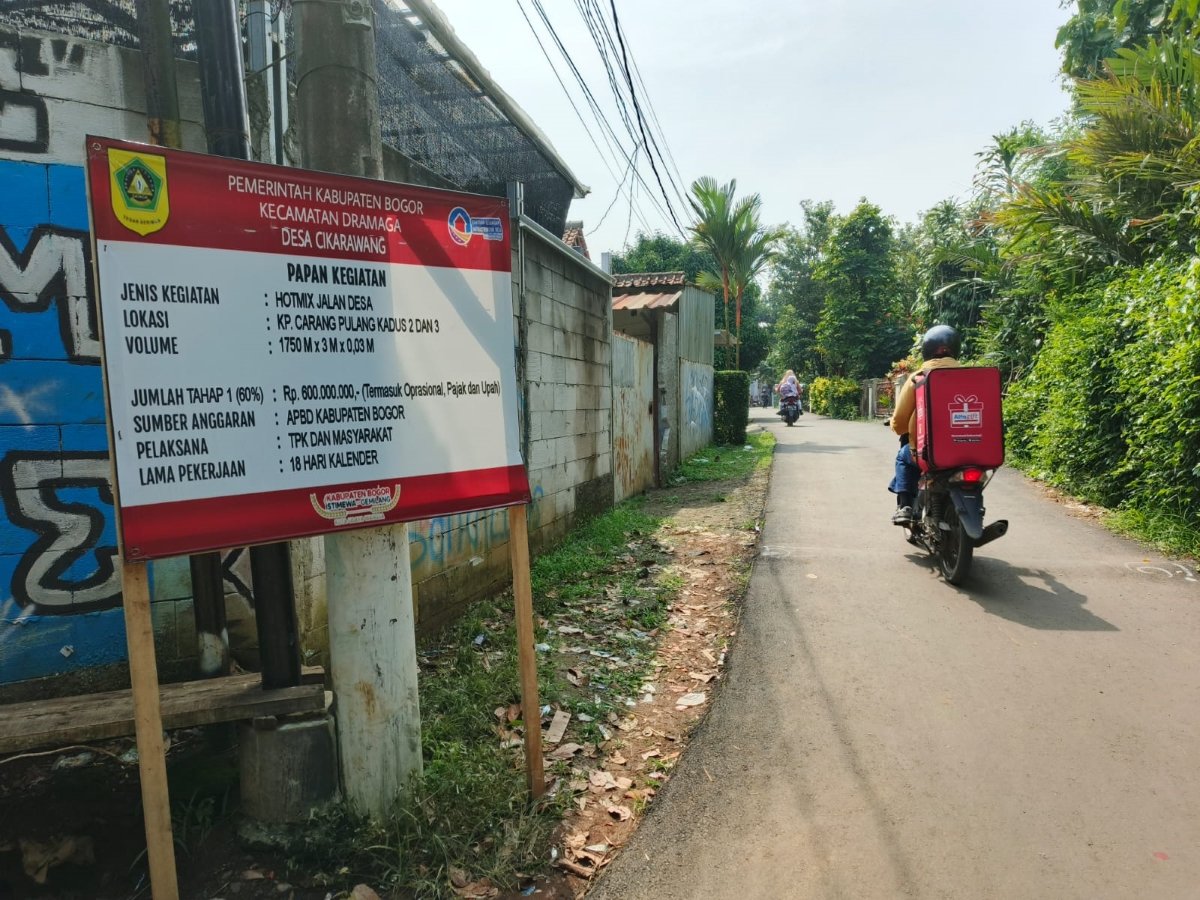 Ketua tim monev Kecamatan Dramaga, Hj. Ine Handayani, menegaskan pihaknya sudah melakukan pengukuran fisik pembangunan aspal hotmix jalan desa di dua dusun di Kp Carang Pulang, desa Cikarawang. Hasilnya, sesuai dengan RAB perencanaan tahap pertama.