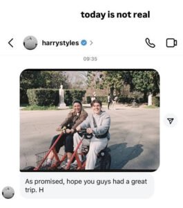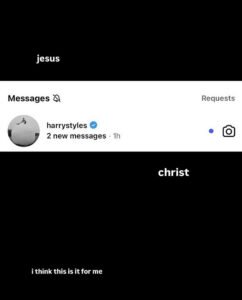 “Jesus Christ! Saya pikir ini untuk saya,” tulisnya di Instagram Story miliknya disertai tangkapan layar notifikasi pesan dari Harry Styles.