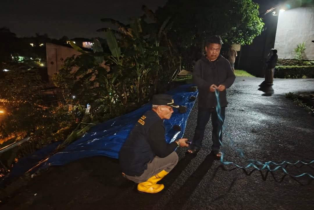 Setibanya di lokasi longsor, Camat dan tim dibantu ketua RTRW perumahan Alam Sinarsari memasang dan menutup material longsor dengan sebuah terpal berwarna biru ukuran 8 x 6 m, guna mencegah terjadinya longsor susulan.