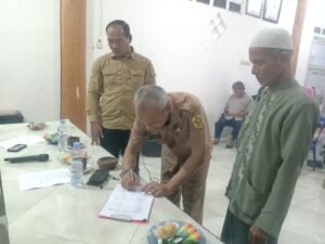 Camat Dramaga, Atep S Sumaryo saat menandatangani Berita Acara Musdes Dana Desa 2026 di Purwasari Bogor/Asof/koran Indonesia//